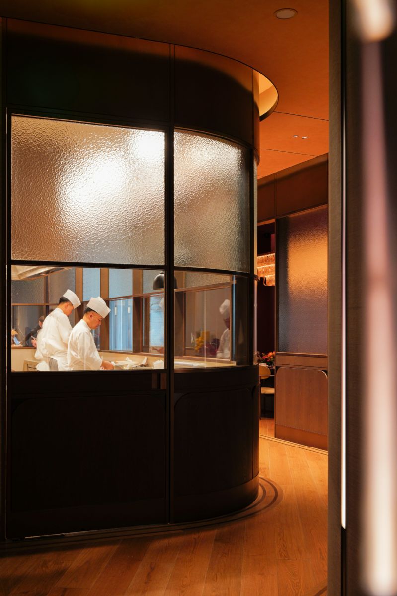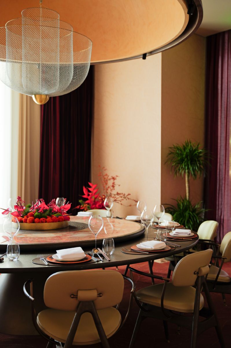 私宴包厢空间由来自澳洲的Mitchell & Eades设计工作室担纲,以叙事美学融汇隽永精致与当代人文体验,汲取上海文化之包容流动与东西方设计美学的流影交融,为宾客打造蕴含当代上海气韵的餐饮空间。设计灵感不仅源于旗袍轮廓,更深入其精妙细节:盘扣的匠艺在定制家具上得到体现;面料丰富的纹理与图案,塑造了吧台与茶艺区触感细腻的细节装饰。这一演进的设计语言延伸至装饰艺术风格,在灯具、座椅、餐具、地毯和其他装饰品的形态中得以重新诠释,令私宴包厢于几何细节间平衡亲密惬意与仪式感,铸就摩登优雅的用餐雅境。