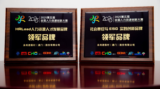 2026年1月12日,澳门讯 — “2025第五届全国人力资源创新大赛”日前揭晓获奖榜单并举行颁奖典礼。永利渡假村(澳门)股份有限公司于本届赛事中荣获“HRLead 人力资源人才发展品牌领军品牌”、“社会责任与ESG实践创新品牌领军品牌”两项殊荣,充份彰显了公司在人才培育发展、企业社会责任及可持续发展领域的卓越成果,备受业界权威肯定。