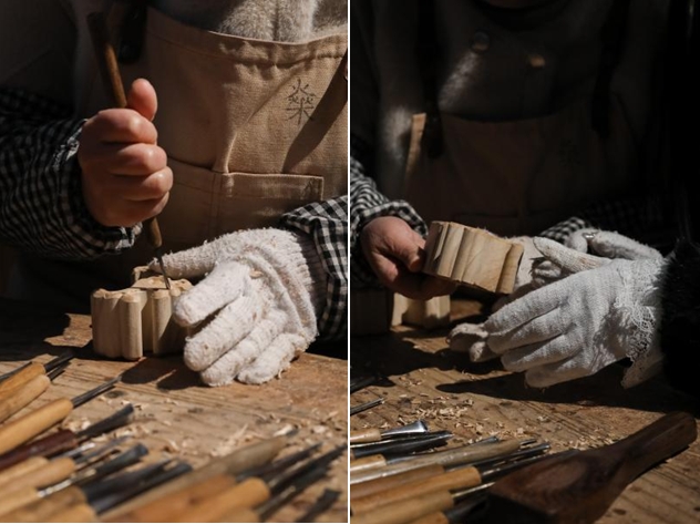•“魂”之传承:展览特别设置“匠人现场”单元,通过记录工匠雕刻场景:从业三十余年戴白色手套的匠人手持刻刀,在浅色木料一笔一画地上雕琢波浪形各式纹理,工作台散落的木屑与整齐排列的木质刀柄刻刀工具,见证“以刀代笔”的专注。正如前言所述:“每一缕木香,皆是岁月与生命的共韵。”