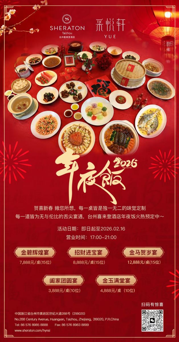 年夜饭现推出五款套餐,适合不同欢聚规模:阖家团圆宴3,888元/桌(10位)、金玉满堂宴4,888元/桌(10位)、金碧辉煌宴7,888元/桌(15位)、招财进宝宴8,888元/桌(15位)及金马贺岁宴12,888元/桌(15位)。席间尽是 “台州味三板斧”:糯叽叽、甜蜜蜜、鲜哒哒。
