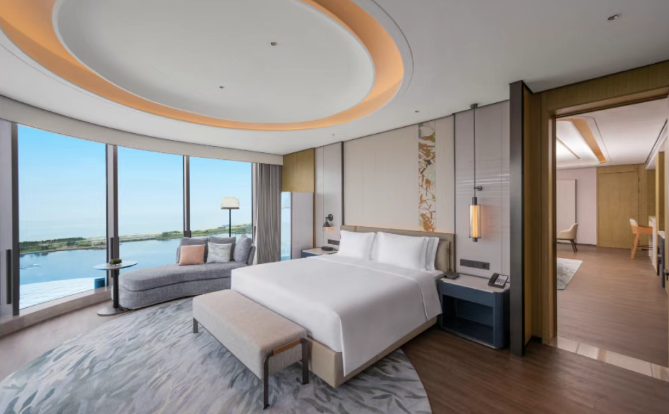 设施方面,我们以 “山海文化融合” 为设计理念,将海洋元素融入每一处空间:拥有 328 间现代风格客房,每间都配备独立商务办公区、智能客控系统和高速网络,更通过全景落地窗设计,让宾客躺在床上就能欣赏湖海交织的美景。