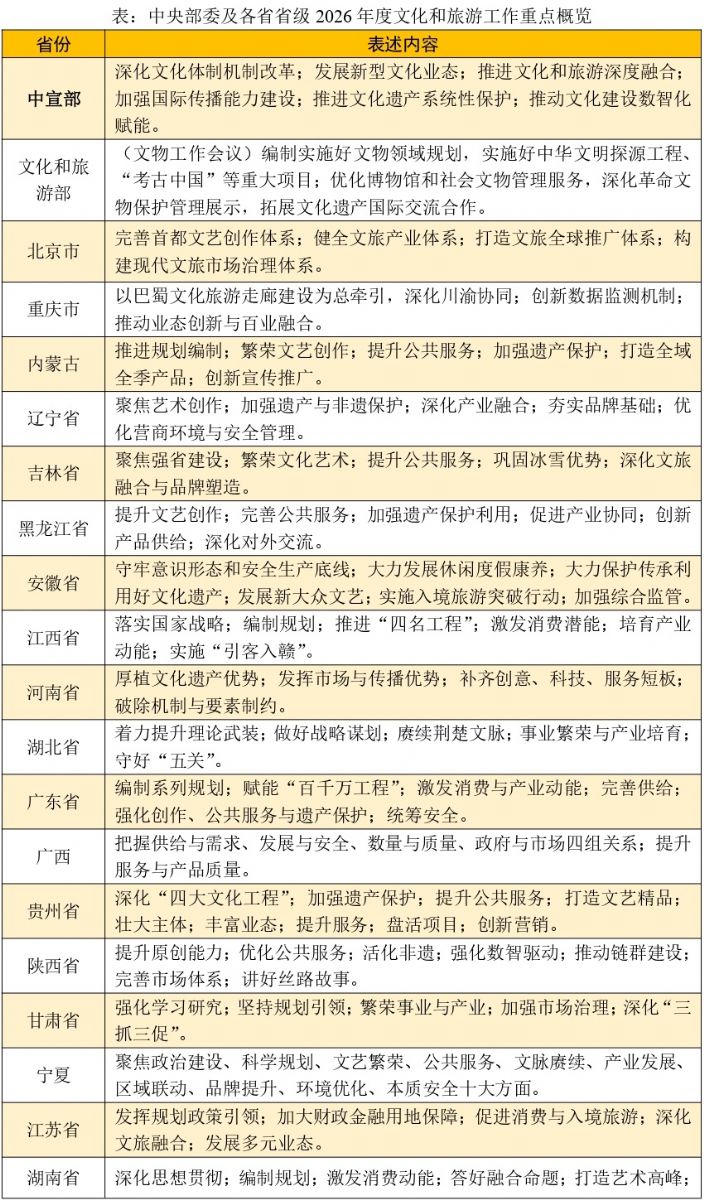 现将中宣部、文化和旅游部及各省市(含自治区)文化和旅游工作会议中2026年重点安排整理如下。