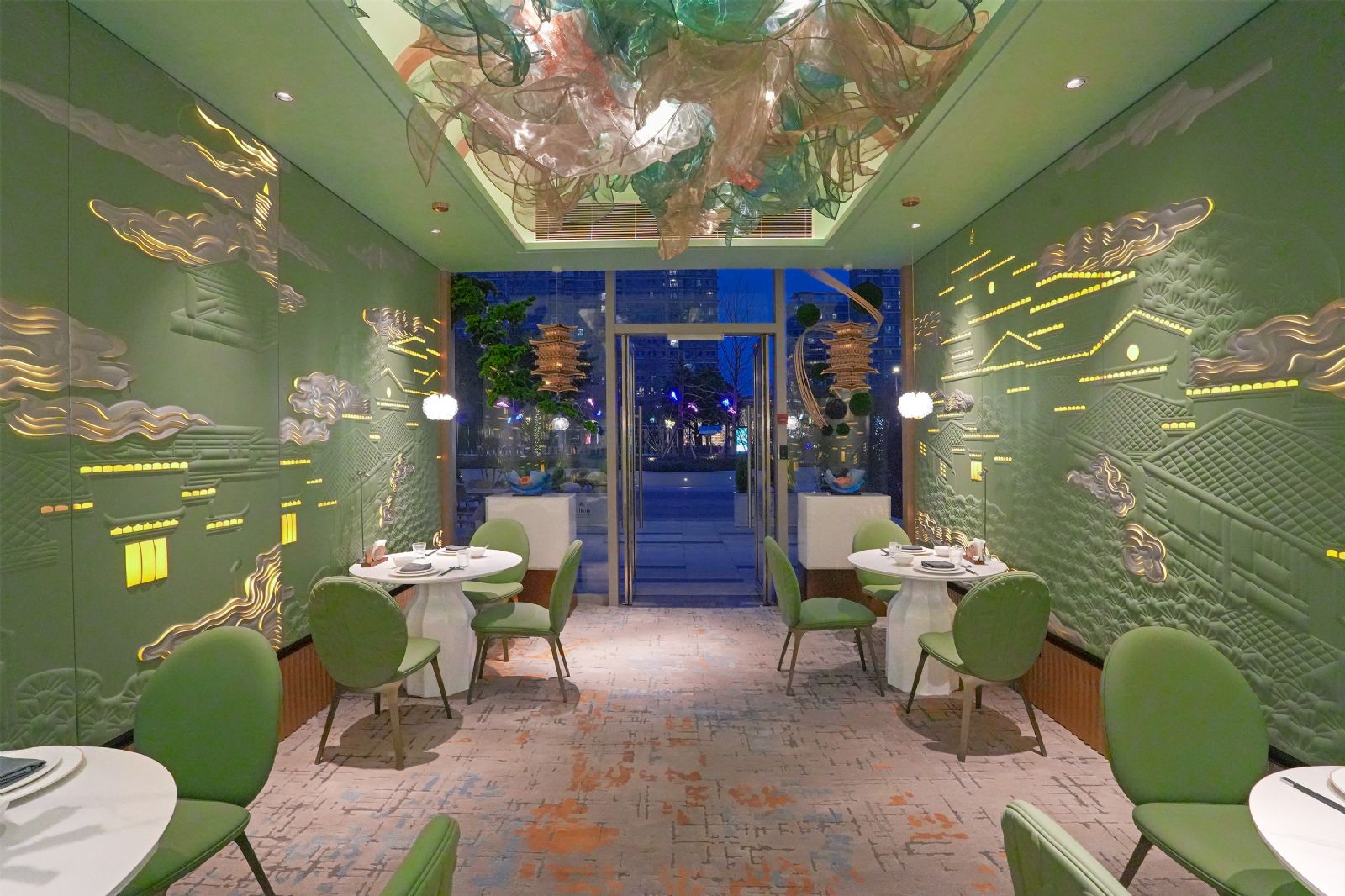 步入餐厅,玉色青绿为主调的空间徐徐展开,山水云海层叠铺陈,光影流转间宛若星河入梦。中央盛放的锦花艺术墙成为视觉焦点,层层花瓣在光影中绽放,将“花光似锦”的画面定格于当下,为人间烟火中的好时光与好滋味,铺陈一方如画底色。