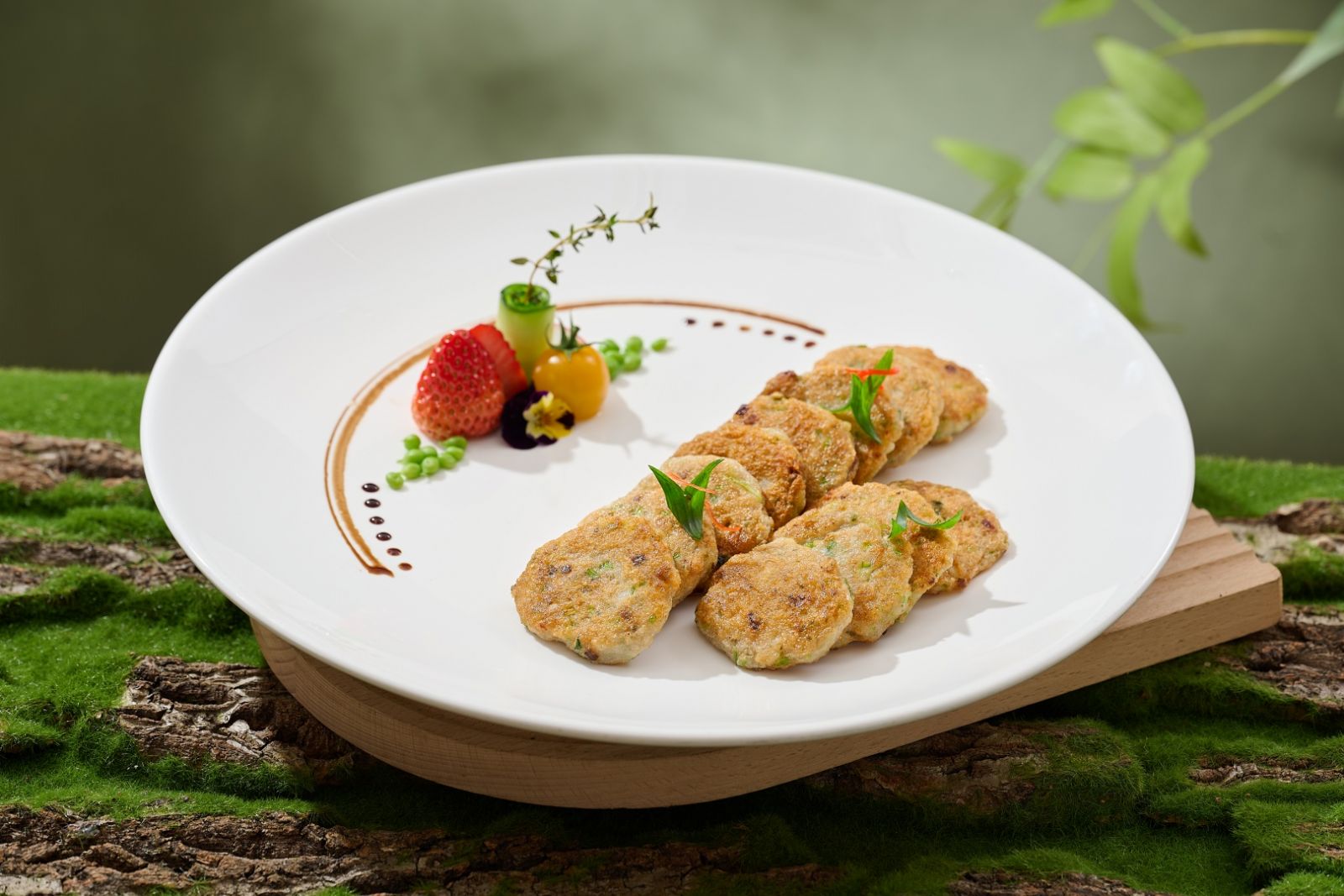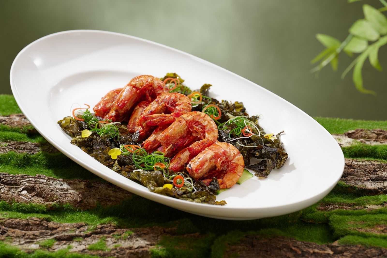 火焰东江盐焗鸡选用粤北散养果园鸡,以传统客家盐焗为基底,辅以火焰创意呈现,外香内嫩,烟火气中藏着一座山的馈赠;蜜味茶皇九节虾则采明前春茶入馔,一芽一叶锁住春意,虾鲜与茶韵交织,清润与甘香层层递进。
