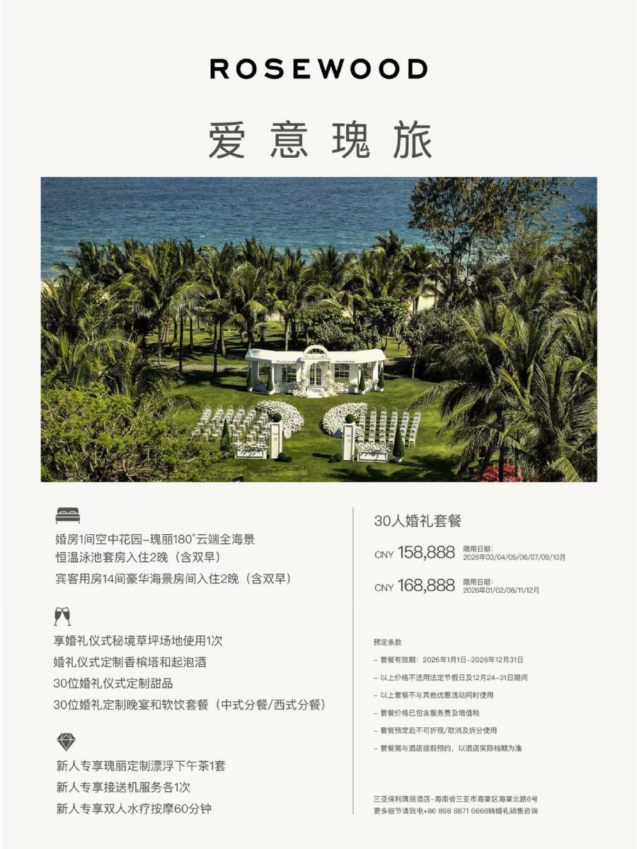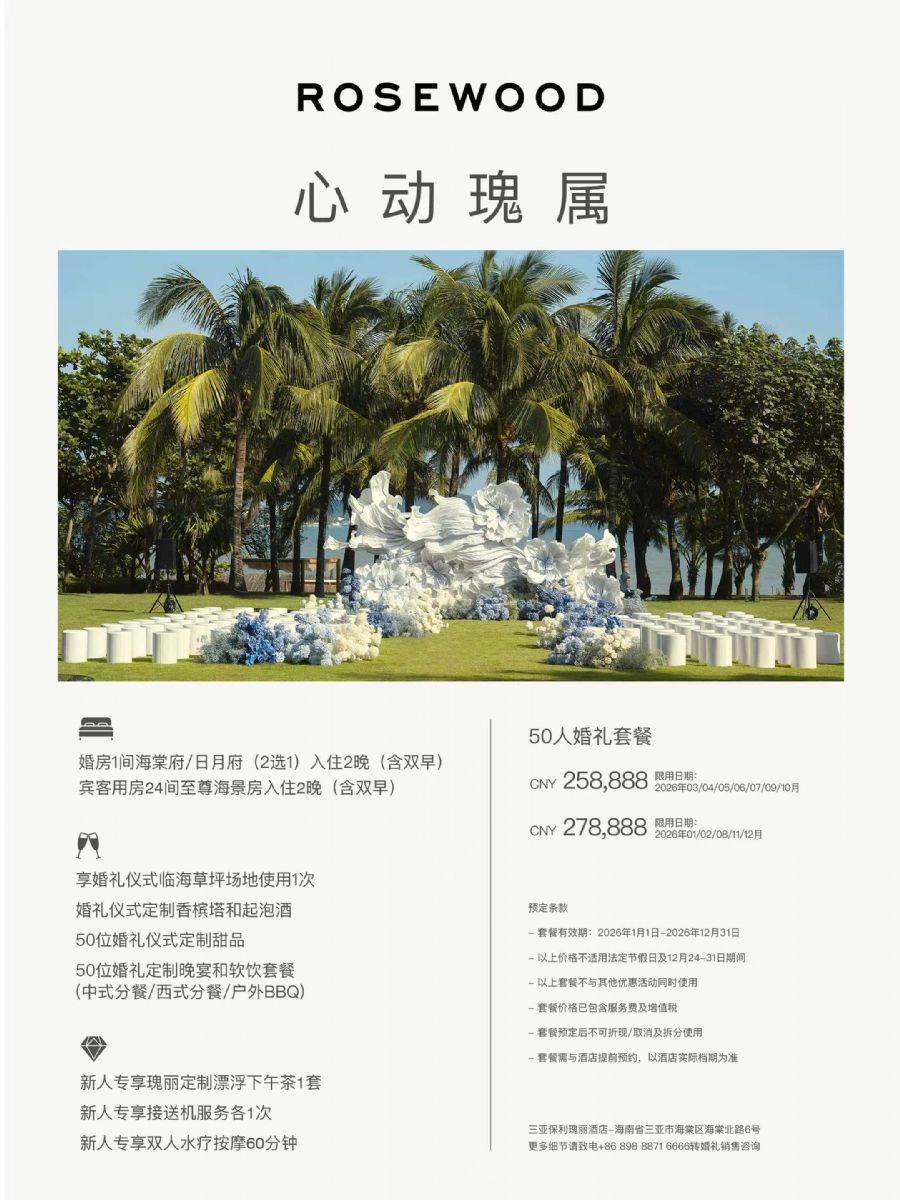 在三亚保利瑰丽酒店的四幕婚礼叙事中,瑰夏草坪承载着「探索爱」的篇章。继海棠府1214房间的「发现」与座千峰观景池畔的「感受」之后,爱侣于此地跟随光的指引穿行——花瓣与海风拂过裙摆与衣角,两处人影凝结成一条重叠的溪流。而后暮色四合,他们将继续走向秘境草坪的「抵达」。瑰夏草坪,正是这段旅程中最为舒展、最为自由的章节。