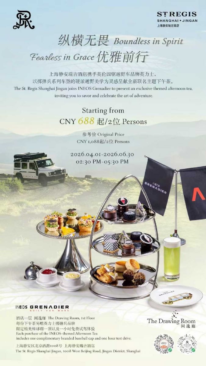 近日,上海静安瑞吉酒店宣布将携手英伦硬派越野品牌英力士掷弹兵,于2026年4月1日至6月30日期间在酒店一层闲逸廊限时推出「纵横无畏,优雅前行」联名主题下午茶。此次合作以掷弹兵系列车型的硬派越野美学为灵感,结合瑞吉品牌的精致优雅,旨在为宾客打造一场融合冒险精神与奢华体验的午后盛宴。