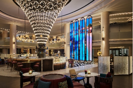 逸庭(R Bar):以上海爵士时代为灵感,核心艺术装置“光影万花筒”以留声机喇叭的复古形态为原型,流光溢彩的折射象征着城市瞬息万变的魅力。日间,宾客可在此享用特色下午茶、醇香咖啡和精致甜点;入夜后,则可体验品牌标志性的"夜•灵感•万丽"(Evenings at Renaissance)体验随之开启。招牌鸡尾酒“蓝色俄罗斯”由调酒师洛丽塔受外滩霓虹启发创作,暗合老上海“蓝色多瑙河”的浪漫。特调鸡尾酒、现场音乐表演、艺术展览以及创意小食等交融呈现一场永不落幕的繁华梦境。