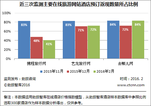 劲旅咨询最新的监测数据显示, 2月份在线旅游网站酒店返现占比与2015年12月份相比有升有降。携程旅行网的2月份在线酒店返现占比与2015年12月相比有所下降,从48%下降到41%;2月去哪儿网的在线酒店返现占比为84%,较去年12月的72%相比上升了12个百分点;艺龙旅行网2月的在线酒店返现占比有所上升,从71%上升到72%。
