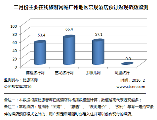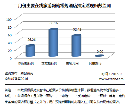 2月艺龙旅行网的在线酒店返现力度依旧最大,返现指数为68.16,与2015年12月相比有所下降,环比下降了10.00%;携程旅行网2月份返现指数为26.26,与去年12月的23.79相比,环比上升了2.47%; 2月份去哪儿网的返现指数为52.42,环比下降了33.99%。根据劲旅监测显示,目前在监测样本范围内,阿里旅行的酒店尚未发现有返现活动开展。