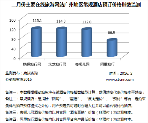 2月,携程、艺龙、去哪儿三家在线旅游网站的常规酒店线上公开价格指数与2015年12月比均有所下降,而本月新加入监测的阿里常规酒店线上公开价格指数为75.28,指数最低,相对占优;携程旅行网2月份酒店价格指数为90.32,与去年12月份相比,环比下降了0.95%;艺龙旅行网2月份酒店价格指数为91.53,相比于去年12月份的酒店价格指数呈上升趋势,环比上升了0.70%;去哪儿网2月份的酒店价格指数为90.87,环比下降了0.57%。