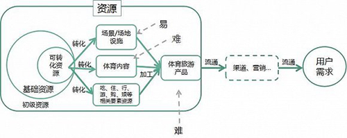 在资源端,场景/场地设施的转化在有政策支持的情况下相对容易,依托于旅游业的发展,吃住行等其他基本要素资源已具有一定的形态和规模,而体育内容的打造以及最终整合加工过程却是很难。目前国内的体育产业是以体育装备等制造业为主,体育IP能力较弱。