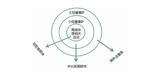 体育旅游大致可以分为参赛型、观赛型、运动体验式、培训型、休闲型等几类,不同类型产生不同的消费场景,对各细分群体的覆盖程度不同,在整个产业链中发挥的作用也不同,应根据这些“不同”特性对应需求结构进行产业结构的搭建。以赛事类为例,按照覆盖群体将以赛事IP为核心的体育旅游进行重新划分,主要分为高频体关活动、小型赛事IP、大型赛事IP三类。