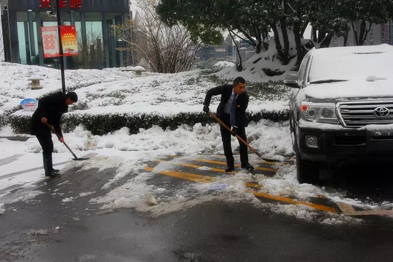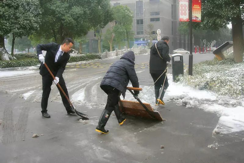 由各部门经理带队抽调员工组成扫雪队伍,大家冒着凛冽的寒风,纷纷拿起铁锹、扫帚等工具,按照分工积极投入到积雪清扫工作中。