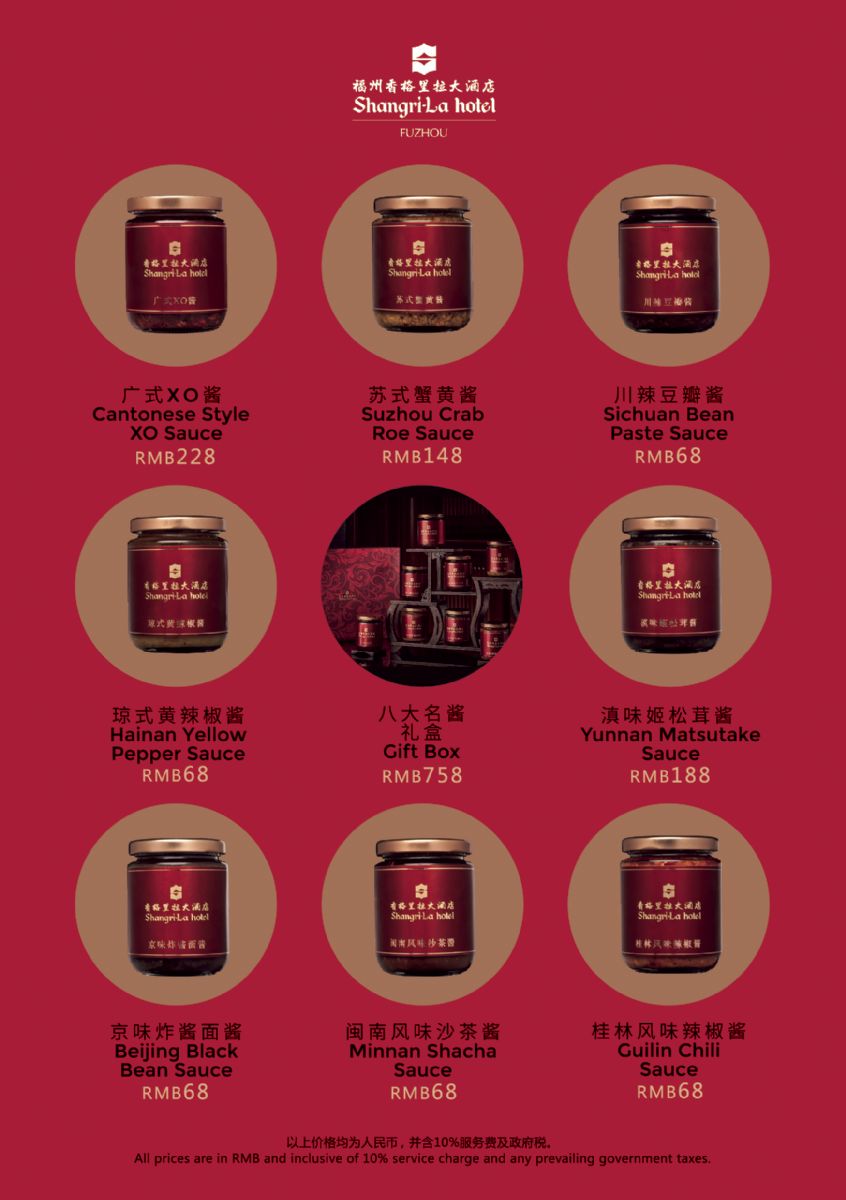 香格里拉酒店汇聚中华大地八大名酱,集百味之精华,酱心独具,以礼呈现,香传天下。各款酱料都颇具特色: