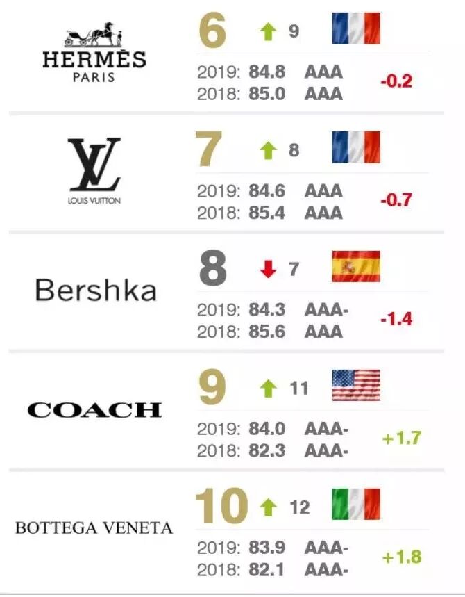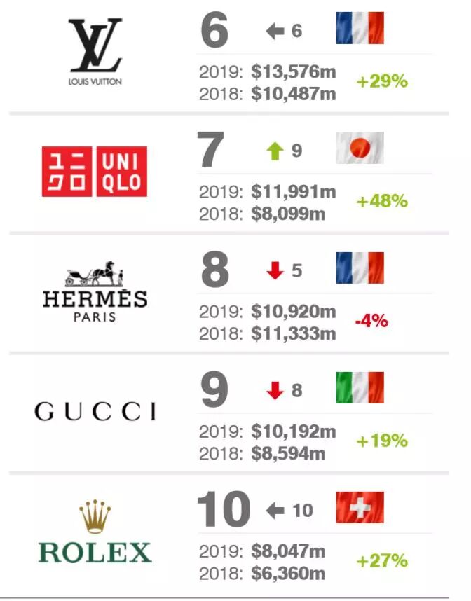 奢侈品牌进入榜单前十位的还包括:Cartier(第五位)Louis Vuitton(第六位)、Hermès(第八位)和 Gucci (第九位)、Rolex(第十位)。