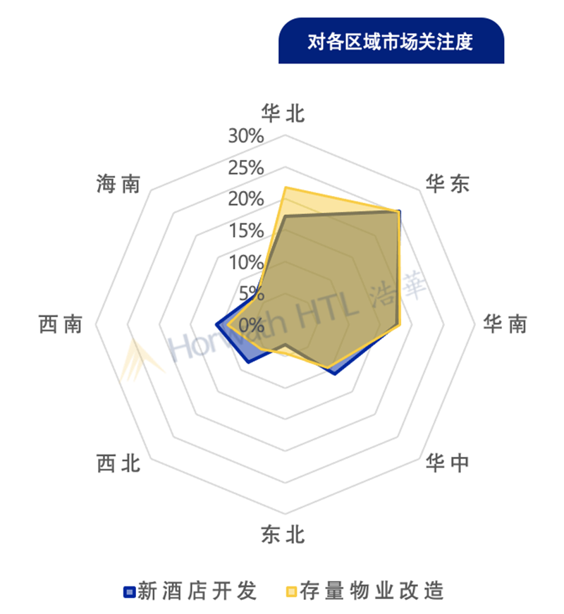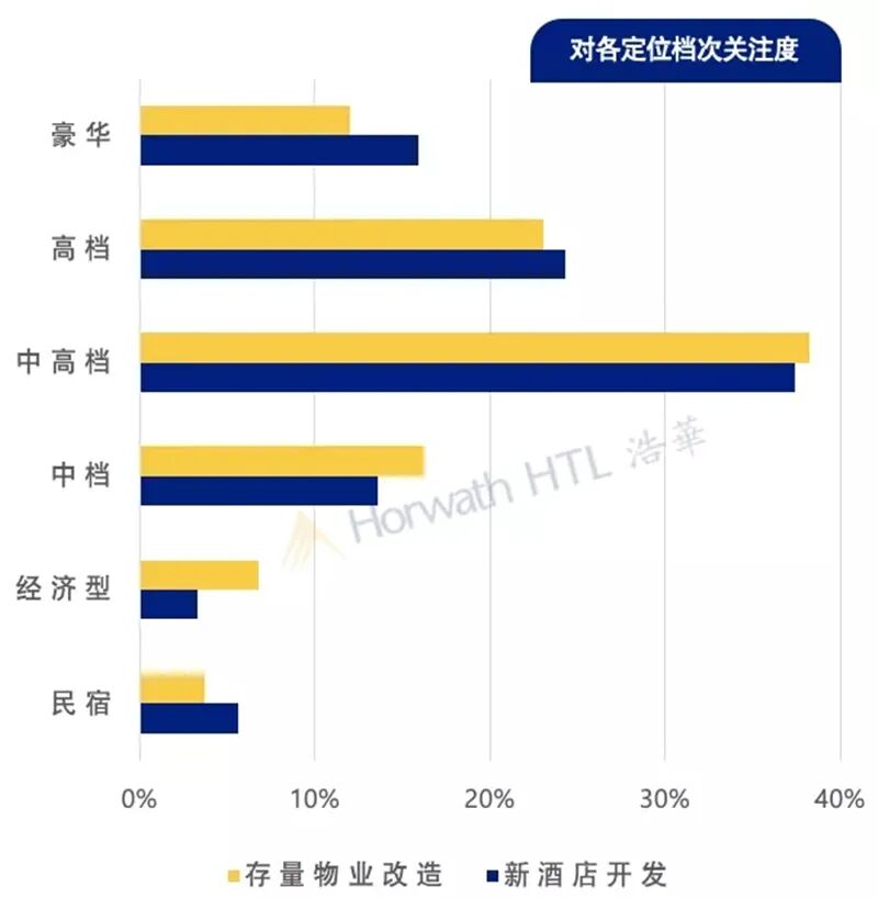 中高档酒店不论在新酒店开发(37%)还是存量物业改造(38%)方面都是投资者的重点关注对象。与去年调查结果不同,今年投资者对于高档酒店的物业改造热度明显降低,从关注度首位降至次位。中高档无论是新项目投资还是存量改造,其通过产品特色打造更容易实现相对健康的投资回报,因此,在投资决策时更容易做出决定。但高档酒店无论是新建还是改造,其自身的现金流投资回报并非理想,且投资金额大,因此,在投资决策时往往需要更长的时间做出决定。