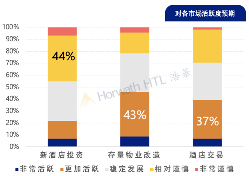 整体看来,存量物业改造依然是大家最为看好的市场,超过53%的受访者认为存量物业改造在接下来的一年中将更加活跃。疫情“灰犀牛”叠加中国经济增速放缓的影响可能催促一大批设施老旧、竞争力低下的酒店进入更新改造周期,力求通过产品更新使资产开启新一轮的生命周期并显著提升资产价值。