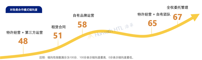 由于受访业主以偏好中高档以上定位酒店物业的房地产商为主,因此市场中最为流行的全权委托管理的模式仍是倾向性最高的管理合作模式。但值得注意的是,特许经营加自有团队模式的倾向性已提升至与全权委托管理相似的水平。在这种合作模式下,酒店不仅可以享受酒店品牌所带来的强大会员体系与系统性支持,也可以在业主自有团队更加灵活的管理制度下获得更高的经营利润,从而为业主提升现金流收益。相较之下,特许经营加第三方运营的模式市场认可度暂时偏低。通常,这种模式下业主需要为两家专业公司支付更高的管理费总额,因此对于第三方管理公司成本管控的要求更高。虽然这个模式在美国已十分成熟,但考虑到中国酒店业主仍以房地产商为主,第三方运营公司如何在中国的经营环境下证明自身价值仍有待观察。