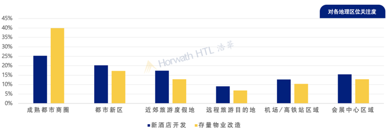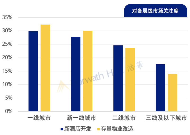 与2020年初(疫情前)调查结果不同,此轮调查中不论是新酒店开发(30%)还是存量物业改造(32%),一线/新一线城市的受关注度都排名最高。表明投资者在市场动荡变革期更加偏好风险更为可控的成熟市场。一线/新一线城市虽然受国际交流停滞影响最大,但由于其多元化的客源结构、丰富的市场层级及充分的房价深度,因此业主更为认可一线/新一线市场物业的长期持有价值。
