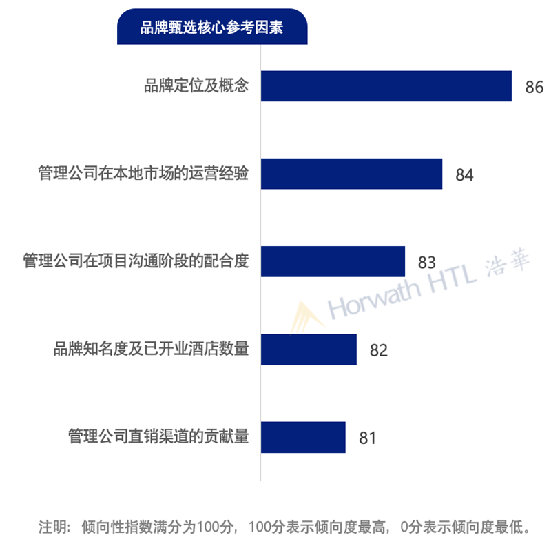 在为拟建酒店选定品牌时,酒店品牌的定位与概念是否与项目整体规划理念相符是业主关注度最高的一点。相较之下,品牌知名度与已开业酒店数量则是次要选项,某些项目可能为了其独特的定位而选择一些相对小众或知名度较低的品牌。在明确与项目相符的品牌范围后,业主需要对于管理公司能力进行评测。这时,管理公司在本地市场的运营经验以及在接洽阶段的配合度则成为了重中之重,表明业主对于本地/相关经验以及沟通顺畅度的看重。“接地气”的管理公司更容易受到业主的青睐。整体看来,受访者对于五个选项的认同度都很高,表明业主认为这五个方面在品牌甄选阶段都需要认真考量。